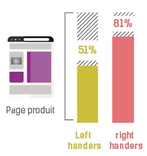 right_left_handersPiù interessante, e meno sessista, l’infografica di pagina tre, che confronta il comportamento di “mancini” e “destri“. Anche in questo caso il confronto fornisce numeri inequivocabili, i “mancini” cliccano di meno, sono significativamente più lenti nel selezionare e, conseguentemente, acquistano di meno.