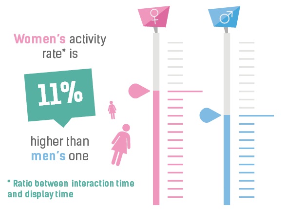 womens_better_mensLa prima infografica ci fornisce subito uno spunto interessantissimo, le donne sono più veloci degli uomini, sia nella percezione dei prodotti proposti on line, sia nel click finalizzato all’acquisto,  sia nell’ “activity rate” ovvero nell’intervallo, nel tempo che intercorre, tra la visualizzazione e l’interazione.